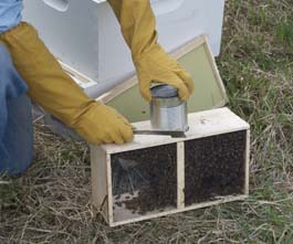 Ben bangs the bee cage down so the bees lose their grip on the top of the cage.