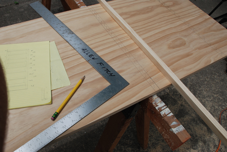 Marking the vertical sides of the shelving for the shelf dados. Those are the plans on the left.